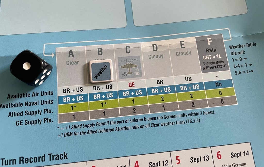 One of the more interesting aspects of the design was the Weather Roll and the Weather Table. At the outset of each turn, the players will roll a d6 to understand how the weather might change. As you look at the Weather Table below you will see that there are only 3 different types of weather, including 3 Clear boxes (A, B & C), 2 Cloudy boxes (D & E) and 1 Rain box (F). But more so than the actual weather itself, the weather actually determines whose Air Units are available for use in that turn, whether the Allied Naval Units are available and also how many Supply Points both the Allies and Germans receive for that turn.