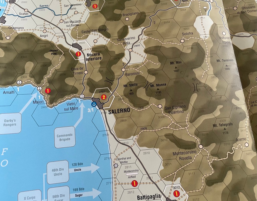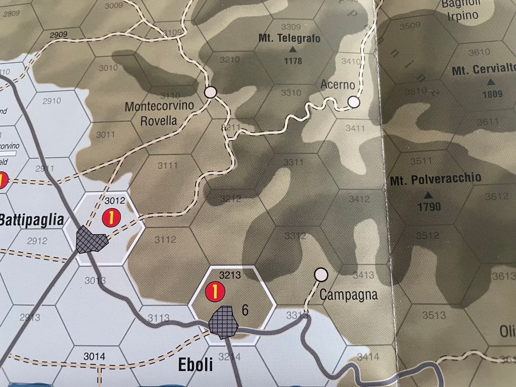 Terrain is the key to the Italian Peninsula. As a defender, you will have to only choose to defend a few key spots in order to box in the Allied advance. The mountains are the definite highlights, particularly those that are surrounding the Salerno Plain as they are very steep and rugged mountains. In the game, Mechanized units are not allowed to cross mountain hex sides and Non-Mechanized units will be Disrupted and likely out of supply if they do cross. The focus on the map is the Salerno Plain and the two main exits of that plain towards Naples in the north and east towards Eboli.