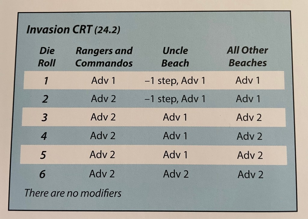 As you can see in the setup picture above, there are 9 Allied Landing Boxes in the form of beaches/ports, 5 for the Commonwealth and 4 for the Americans. These are designated from north to south as Rangers, Commandos, Uncle, Sugar, Roger and a 2nd Wave area behind them, then Red Beach, Blue Beach and a 2nd Wave area behind. The landings use a special CRT called the Invasion CRT and it has 3 columns, one for just the Rangers and Commandos, one for Uncle Beach and then one for all other beaches. There are no modifiers for this CRT and the player simply rolls for each of the invading stacks of units and the consults the appropriate table for the results.