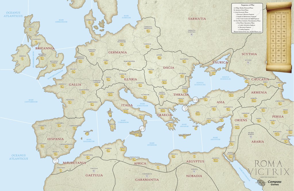 Paul: The game-map consists of Provinces which are subdivisions of larger areas called Regions (i.e., Belgica is a Province located in the Region of Gallia). As Roma Victrix covers a period of time of more than 700 years, compromises and accommodations were made in terms of delineating provincial boundaries. The boundaries of the Roman Provinces depicted on the game map roughly correlate to those of the Empire at or about 200 AD.