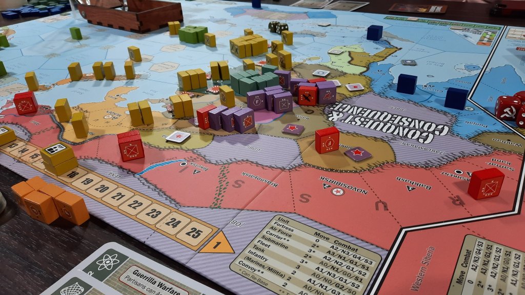 As you would expect, one of the major focuses of the game is on naval operations. Each side, with the exception of the USSR, needs to focus on the development of a standing navy that can take the action to the aggressors when the game heats up. The Japanese have a starting advantage in their navy with their Naval Radar that allows their Fleets to fire first possibly eliminating enemy units before they can fire back. They also have to rely on their Aircraft Carriers as they can launch Carrier strikes and fire and immediately retreat to safety. Submarines are also important as they can move through enemy ships and can also escape Sea Battles to fight another day.