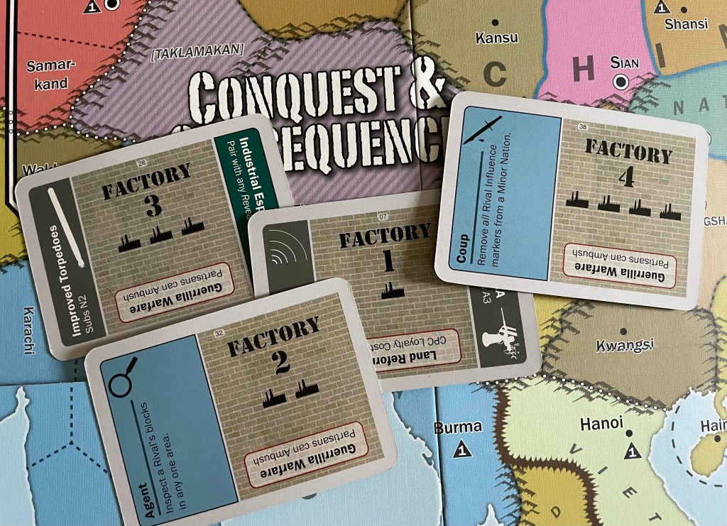 These cards work equally as well in C&C as they did in T&T and allow players the ability to attack early on in the war to mimic the colonial efforts of the Japanese but also to influence by more peaceful means to coerce or convince other countries to join your cause. I would say that in C&C, more so than in T&T, the process of diplomacy and building relations through acquiring satellites is very card intensive and I found that maybe the Japanese should just invade rather than waste their resources on politicking. This was really the same experience that I had with T&T in Europe while controlling the Axis powers of Germany and Italy.