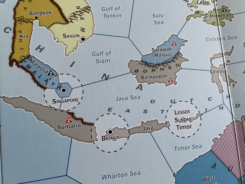 One of the most important areas of the seas is the Dutch East Indies and the rich oil resources found in Sumatra, Balikpapan and Sarawak. These oil resources will count as double for the Japanese so that means they are worth a total of 8 resource points, whereas other nations will only gain 4. That means that the Japanese have to either take them over during the buildup years between 1936-1939 using their Action Cards or plan to build a large navy, which they actually already have at their disposal and take them by force. I found out as the Japanese that this should be on your to do list in the top 3 or you will find you simply cannot compete. The Philippines are also very important as they can serve as a strike base for the Japanese as they can reach most of the sea lanes to southwest Asia from there. To be able to use this as a base, they will have to get aggressive and get their fleet into the battle early to take them over.