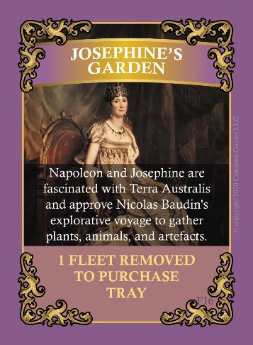 I have even gone so far in Napoleon’s Imperium as to include one Battle Card in the French deck in which the French dispatch a ship to Australia purporting to be naturalists on scientific expeditions. There, they gather native animals, plants and artefacts (flora and fauna), bringing them back to France to feature in Josephine’s garden. But there is also evidence that these naturalists were, in fact, French spies, gathering vital information on the colony’s defences which would be used later.