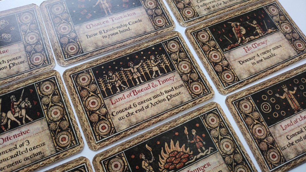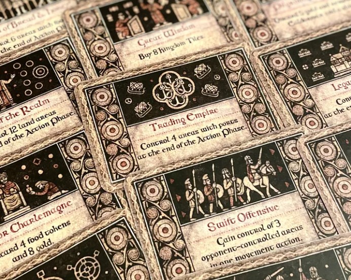 A very important aspect of combat is the completion of Chronicle Cards. In order to complete the Chronicle Card, a player has to perform some significant act that will go down in the annals of history. There are 16 such Chronicle Cards (think of them as special missions) in the game, and they provide Dalcs when completed. These Chronicle Cards include all types of things such as capturing a certain number of cities, controlling specific Areas of the map, having a certain number of Gold or Food icons in controlled territories to making a holy pilgrimage to Rome itself. Each player can complete just two chronicles during the game and players receive permanent victory points, which they cannot lose. This really incentivizes combat and I think their addition to the game solidified that combat is important.
