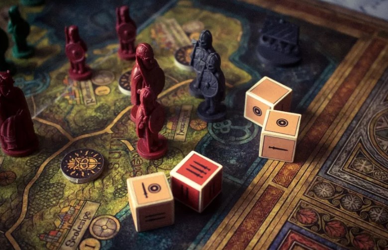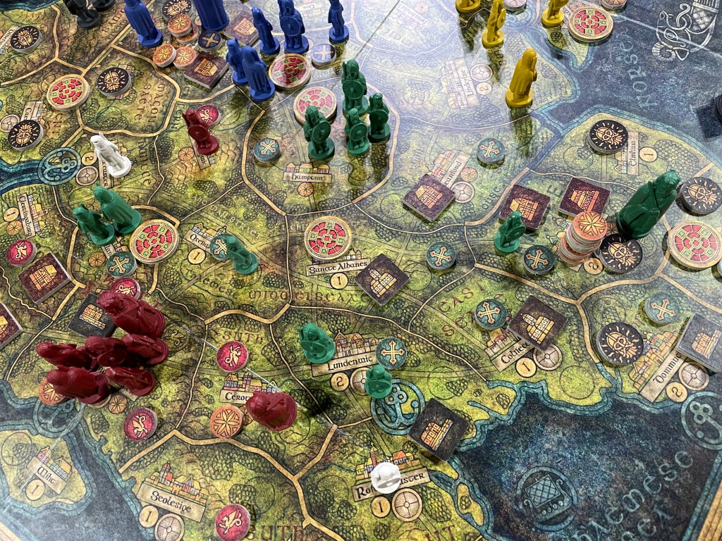 Combat is almost always shied away from in these type of games in my opinion. It is expensive as you have to buy and develop units, move them around the map, feed them and then replace them after battle when destroyed. Also, lots of these Lite Civ Dudes on a Map Area Control games are focused on building your economic and technological side of your nations and if you overspend on military then you are limiting how far you can get in the other areas. Opportunity Cost is an economic principle after all and most of these games do that aspect well. I have always been on the lookout for a game that encouraged and rewarded combat as that is how these kingdoms were normally built….through conquest! Bretwalda incentivizes combat in several key ways, including in the lay out and design of the board, the need to gain new resources, the fact that victory points (called Dalcs) don’t come from buildings (mostly) or development of technology in the form of Kingdom Tiles and in rewards from accomplishing Chronicle Cards. Let’s take a look at each of these aspects.