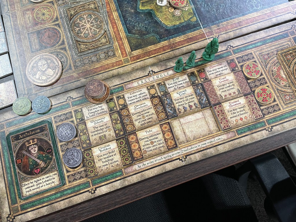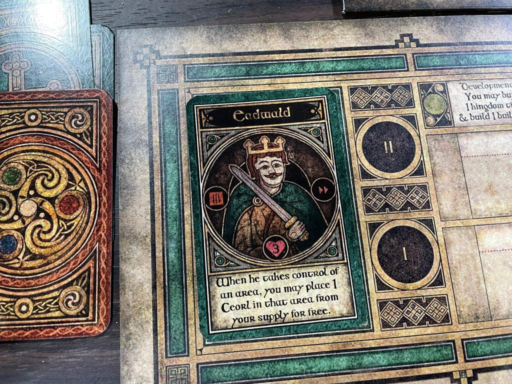 Another example of a different East Anglea Ruler ability is extra defense when attacking in an area you control. I really like that each Ruler is unique but also that you can use them to establish your strategy and then maintain as you develop your kingdom. It is important to remember though that these Rulers can also be killed in battle so you have to be a bit careful with them until their ability becomes expendable. Once they meet their untimely end, you can simply fill in with the next Ruler up and ever so slightly course correct your strategy to take advantage of their ability. But beware as if you ever lose all 3 Rulers you will automatically end the game and lose in defeat. A very cool part of the design that will allow lots of flexibly and crafting of strategy in each play of the game.