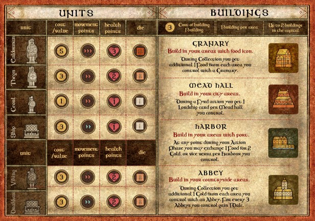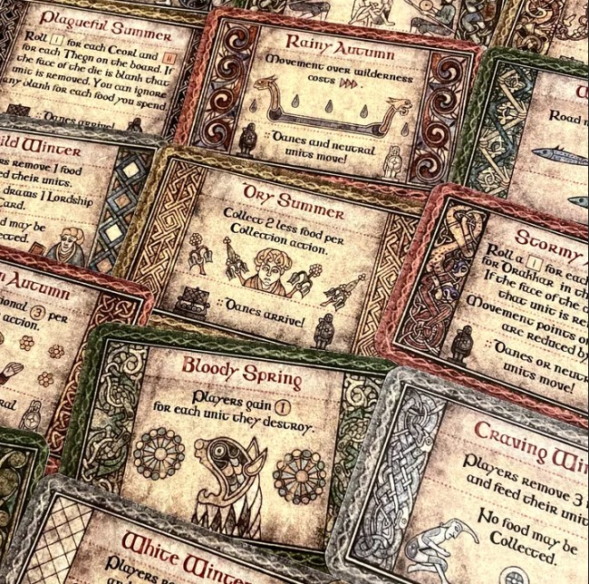 The cards have various effects that can impact the Action phase. For example, the event Bloody Spring (which is a very good one by the way) allows players to gain Gold for destroying opposing units during a battle. In addition to the Season Card event effect, each of the Seasons has a specific impact with the exception of Spring. In Summer, Danes will land in spaces on the board as previously discussed. In Autumn, Danes and Neutral Units may be moved by players to cause havoc and in Winter, players will