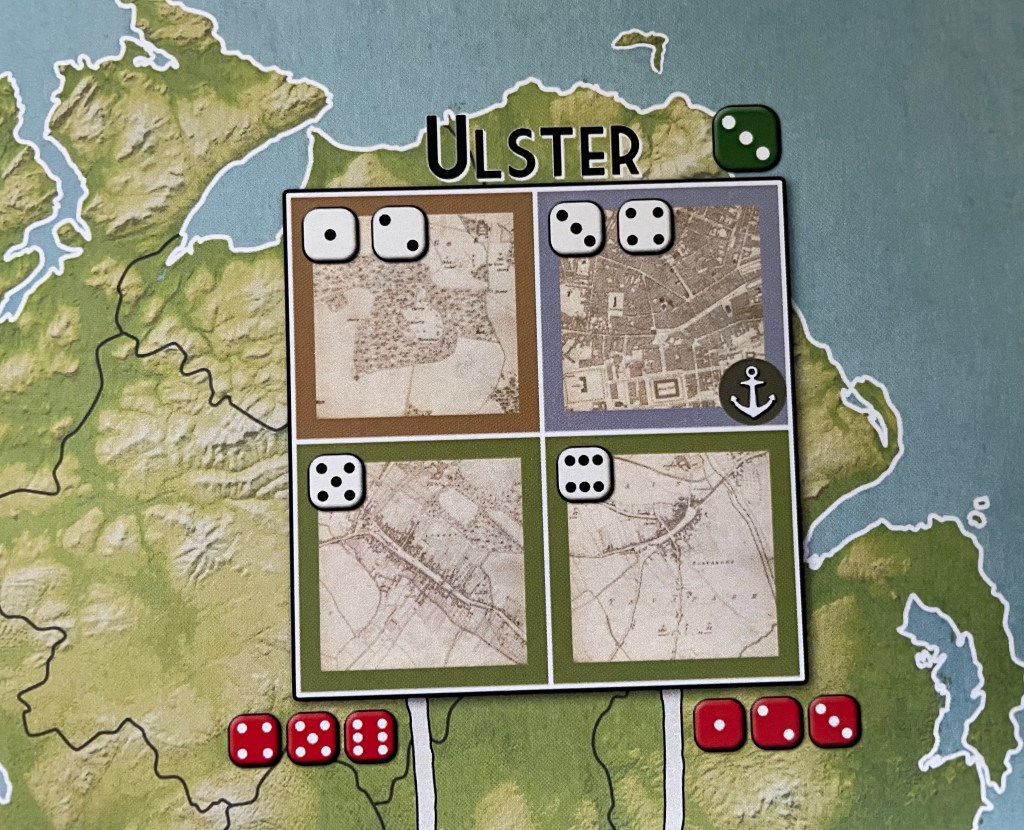 If the AI cannot find a target in the Region that was rolled, they will roll another die to determine to which adjacent Region they will move via the roads and then will land on the weakest enemy unit. This might seem really random to the untrained eye who has not played the game yet. The core concept of the game is that of an insurgency. An insurgency of weaker, less well equipped and organized para-military units in fighting off a very powerful and well trained force. I will talk about this in a later section but the Terrain in the Regions is very important and determines the Combat Factor of each unit when a battle occurs in it. The Bogland (light brown) is the home of the Irish Guerillas and their better trained Flying Columns. They are at home in the Bogland and consequently fight better there than in any of the other Terrain. The British Army units and their compatriot Black & Tans fight better in City (gray) or Townland (green) Terrain.