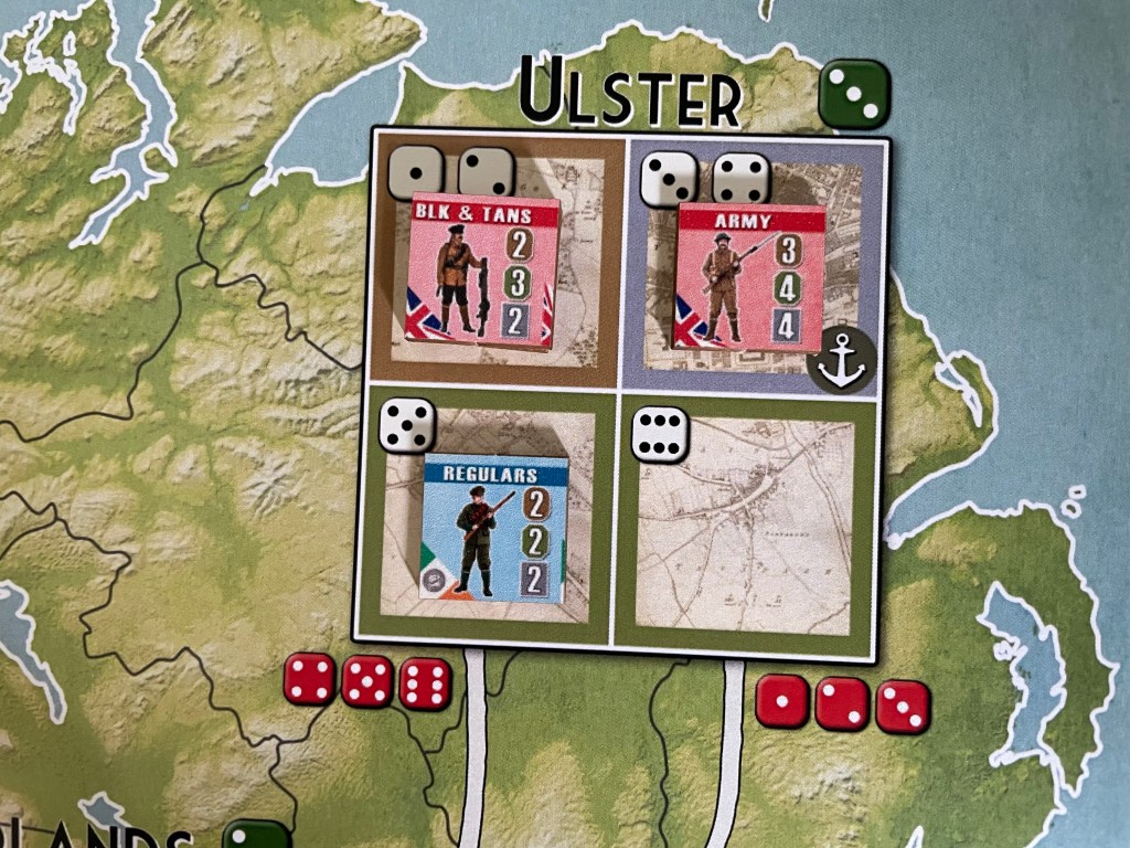The AI gets to act twice in their part of the Sequence of Play, the first is to recruit or upgrade their units on the map. A die is rolled and you will place new units or upgrade existing units (like the Royal Irish Constabulary (RIC) units into Black & Tans, place a new Guerilla or place a new Mob). Then another die is rolled and you will move the most powerful unit in that Region to attack the weakest enemy unit. Very simple.