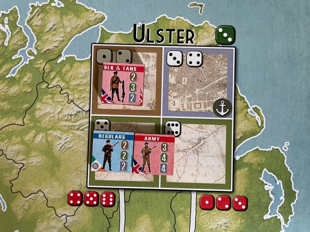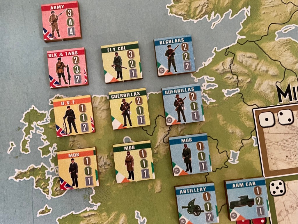 The mechanics used as the basis for this solitaire only game is that of the random die roll. This random die roll is used to control the protagonists in the game in the form of the British during the War of Independence and then the Republicans and Pro-Treaty forces made up of the British and their allies in the Free State Forces during the subsequent Civil War. Nearly every thing that the solitaire AI does seems random. But the randomness is only in the die rolling as the actions that typically come out of it reinforce the actions that would have most likely been taken at the time.