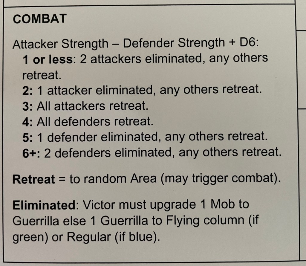 On a result of 3 or 4, one of the sides will be forced to retreat all of their units that participated in the combat. The retreat direction is determined by another die roll (see a pattern here) and can result in another combat if the retreating units move into an Area that is occupied by enemy units. I actually really like the retreat rules as it sets up an opportunity for a combat redo in some ways and can lead to a decisive result that was missed by a poor roll. This also reinforces the insurgency concept as the retreating forces are pushed into other units either awaiting them or come upon them by accident after a battle. I just really like the theme this interjects into the game with only a die roll.