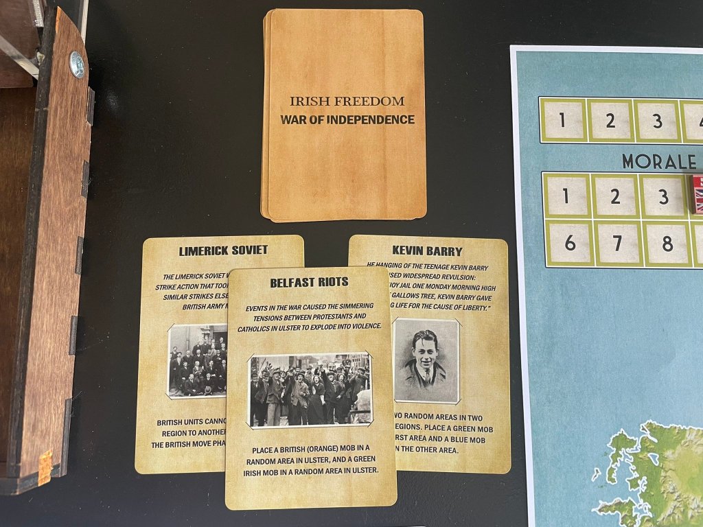 But the greatest part of the cards is the history that you learn from their play. As you can see from the cards pictured below, you will learn about characters such as Kevin Barry who was an 18 year old Irish Republican Army soldier who was executed by the British Government. He was sentenced to death for his part in an attack upon a British Army supply lorry which resulted in the deaths of three British soldiers. This execution inflamed nationalist public opinion in Ireland, largely because of his age. Or the Belfast Riots in mid-1920, when on Bloody Sunday in Dublin, fourteen British intelligence operatives were assassinated; then the RIC fired on the crowd at a Gaelic football match, killing fourteen civilians and wounding sixty-five. A week later, the IRA killed seventeen Auxiliaries in the Kilmichael Ambush in County Cork escalation the war at the time. This gritty and dark history is told well through the play of these Event Cards and I always appreciate the work and time that goes into telling these histories.