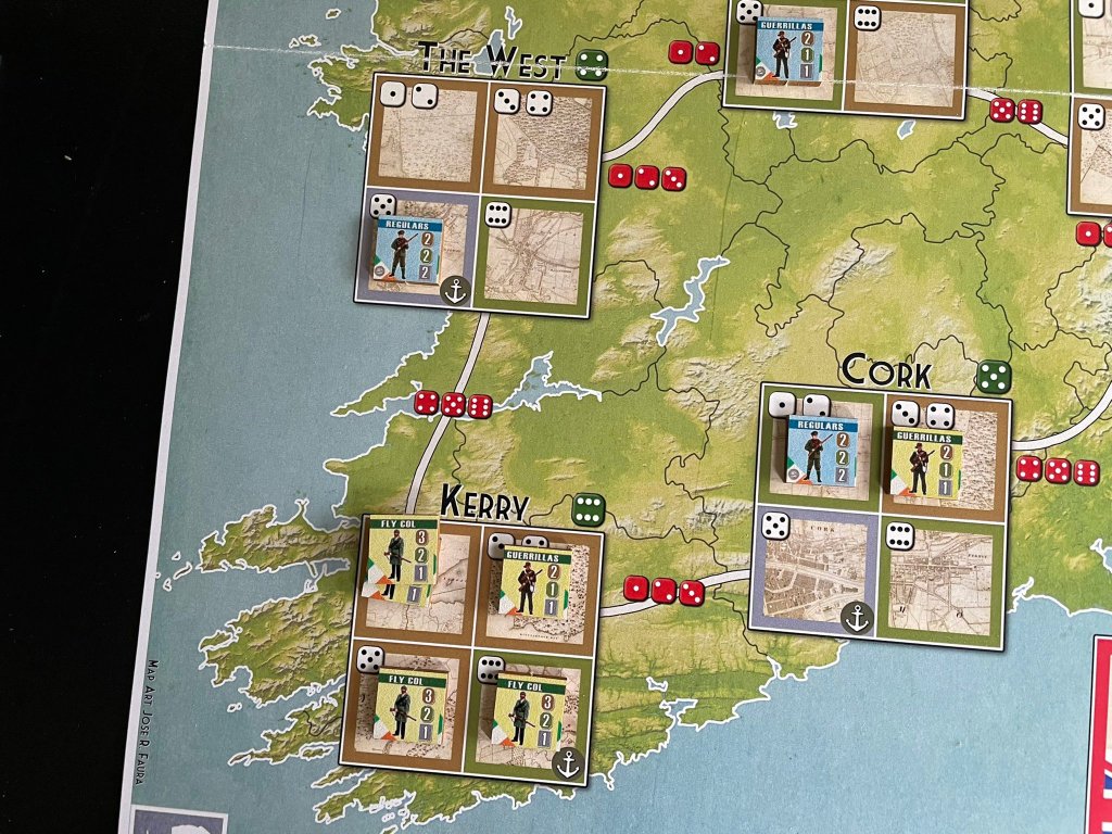 Not every game has to be a deep and complex simulation of a subject. Sometimes, the subject is less gamed and one of the best benefits of the design is simply bringing light to the conflict as well as a better understanding of the issues that caused it to start in the first place. I have said it many times but complexity doesn’t create a good gaming experience. Theme does and the most recent game from White Dog Games called Irish Freedom does this in spades.