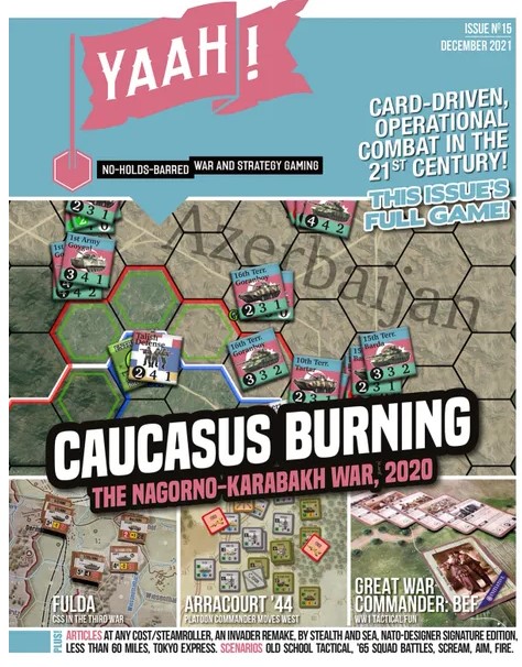 Wargame Magazines are always fun, not only for the great articles but they always have a pack-in game included. Some are good, some are not so good. But in our experience those contained in YAAH! Magazine are always well done. This month, YAAH! Magazine Issue #15 is up for order and the pack-in game is called Caucasus Burning, which deals with the Nagorno-Karabakh War in 2020. I also like that they cover more than just their own games.
