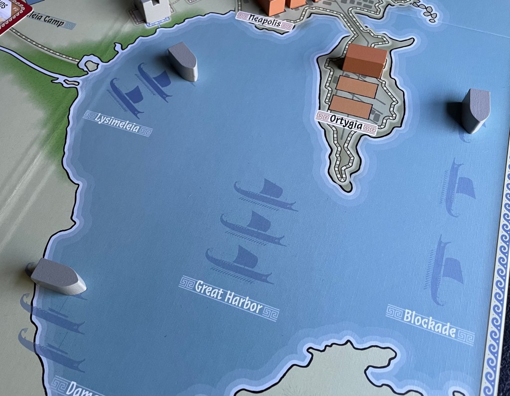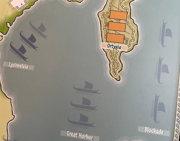 The second part of the wall strategy though is the concept of getting the naval blockade setup, which is a bit more challenging than you would think. The Athenian player will start with 2 ships at the port in Lysimeleia adjacent to the Lysimeleia Camp where the Athenians landed and built their main base at the beginning of the game but eventually must successfully move those ships into the Great Harbor and then into position to blockade the city in the 3 Blockade spaces. This is important to remember that this takes 2 actions and the Athenian player has to have at least one ship in the Blockade location in order to win the game, unless they drop the Syracuse Morale to zero which is very difficult to do.