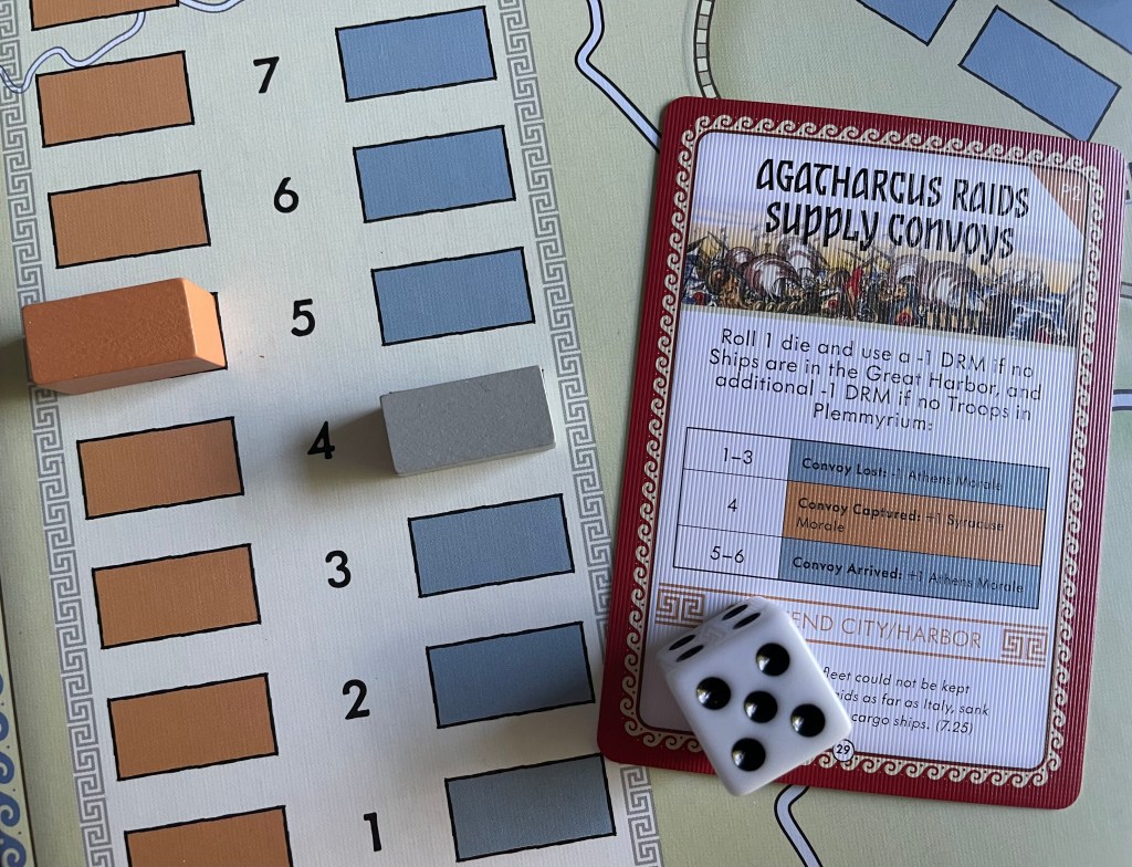 Victory can be a great challenge, and the luck of card draws and poor dice rolling can ultimately sink a player’s hope of victory. But the victory conditions are clear and straightforward and a good plan and strategy will insure that the player is in the game till the last Counter Order Deck Card draw. Remember, building walls and setting up the blockade are your easiest paths to victory but you must be opportunistic, paying attention to what is happening and be ready to move away from wall building if the Syracuse Morale drops low.