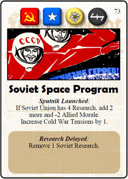 This card showcases two key aspects of the game. First, Research. The two rival superpowers are trying to grab everything that is left of Hitler’s numerous research programs – which are represented in the game as Event Cards and as Research Tokens on the map, which can be captured by any of the 4 factions. While the insurgents will sell, salvage or even use them as weapons on the battlefield (the Werwolf faction’s wunder-waffen strike ability) the Allies and Soviets are trying to send them back home to Washington or Moscow. This pilfering of Nazi scientists has a strong basis in history, particularly the case of Werner von Braun (also a card). The rival superpowers are locked in an arms race from the start of the game as they compete for nuclear and space dominance, and the “research advantage” is a zero-sum game in gaining victory points. For example, if the Soviets have 2 Research at home and the Allies have 1, the Soviets will gain +1 to their Victory Level. This card allows the Soviets to gain a full 2 free Research Tokens directly in the Soviet Union if they already have 4. This is a great way to get ahead of the Allies without having to spend resources or do anything on the map. Note also that 4 Research at home is the minimum requirement to develop nuclear weapons, represented as the card Soviet Atomic Bomb. As the Soviets, 4 Research is something you should be aiming for anyway due to the huge propaganda potential of nukes, but Soviet Space Program allows you to further build on your nuclear program with more points. It also hurts Allied Morale as the American public becomes increasingly intimidated by Soviet power.