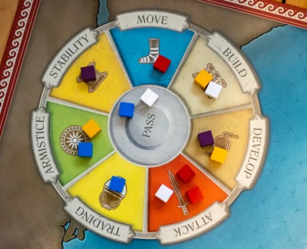 The game is played in highly interactive micro-impulses. The heart of the game is the “action cycle”. An action chosen by a player can’t be chosen by the other player in his upcoming segment. And each action can only be chosen a limited number of times each turn. There is always more you need to do than you can actually do.