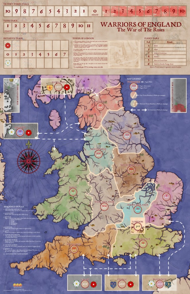 Each player controls Nobles from their respective house (Lancaster and York) and vies for control of lesser Nobles who may leave your cause during battle. Each Noble controls troops and participates in campaigns to gain control of areas that add to their victory points. Control of areas also allows nobles to raise more troops for the cause!