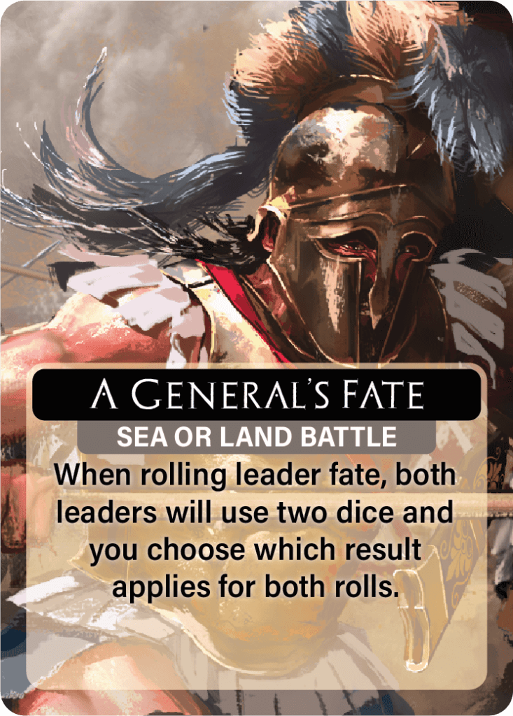 Additionally, the victorious side (or the drawing side) loses 1 involved strength point (e.g. one Hoplite Strength in a Hoplite Battle), while the defeated side loses 2 strength points. The Victorious player also receives a Favour. Finally, each leader involved in battle rolls a custom die. On a failure (one in six), the leader is permanently eliminated. On a success (three in six), the leader becomes experienced (or the player draws a Battle card, if the leader was already experienced).