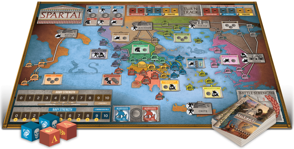 Kris: The design of SPARTA! goes back to my very first steps into (published) game design, when I was looking for a good two-player conflict that included politics and diplomacy. Being from Europe, our first history lessons at school usually treat the ancient