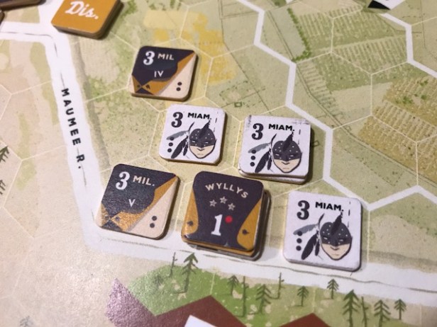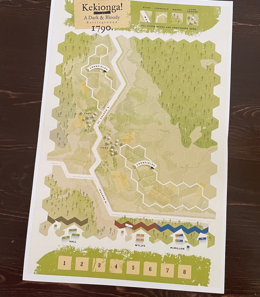 Kekionga!: A Dark and Bloody Battleground, 1790 from High Flying Dice Games is a game that I came across in 2016 solely because of the look of the graphics on the cover and the board. The game is set during the late 1700’s when the fledgling United States of America was dealing with friction on the western frontier of the new country. The struggle for the Old Northwest Territory (what would become the future states of Ohio, Indiana, Illinois, Michigan and Wisconsin) was terribly violent. Massacres and atrocities seemed to follow one upon the other and the Battle of Kekionga in October 1790 was the first battle fought by the United States Army after the War for Independence. The campaign had been ordered by President Washington against the Miami settlement of Kekionga located near modern day Fort Wayne, Indiana, the center of Native American resistance to US migration across the Ohio River at the time.