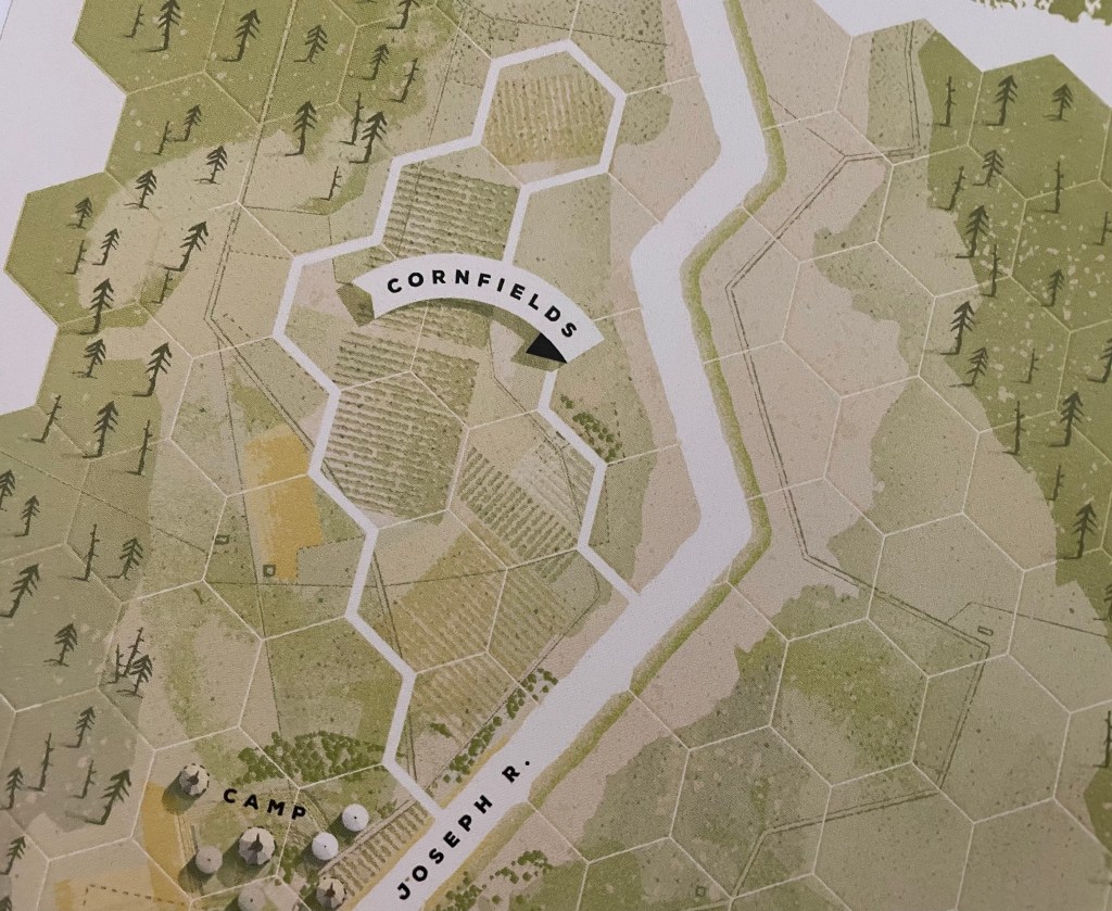 The thing that I love about the way the villages and cornfields are depicted is the use of various colors to set off these hexes to differentiate them from the hexes around them. Not only does Nils draw in the rows of the fields but he also makes them a different shade of green or brown to highlight them individually as their own field which makes them clearly stand out. This is the best part of the board and frankly really wows me that he went to that level of detail and thought to make sure that this key feature of the battlefield was highlighted.