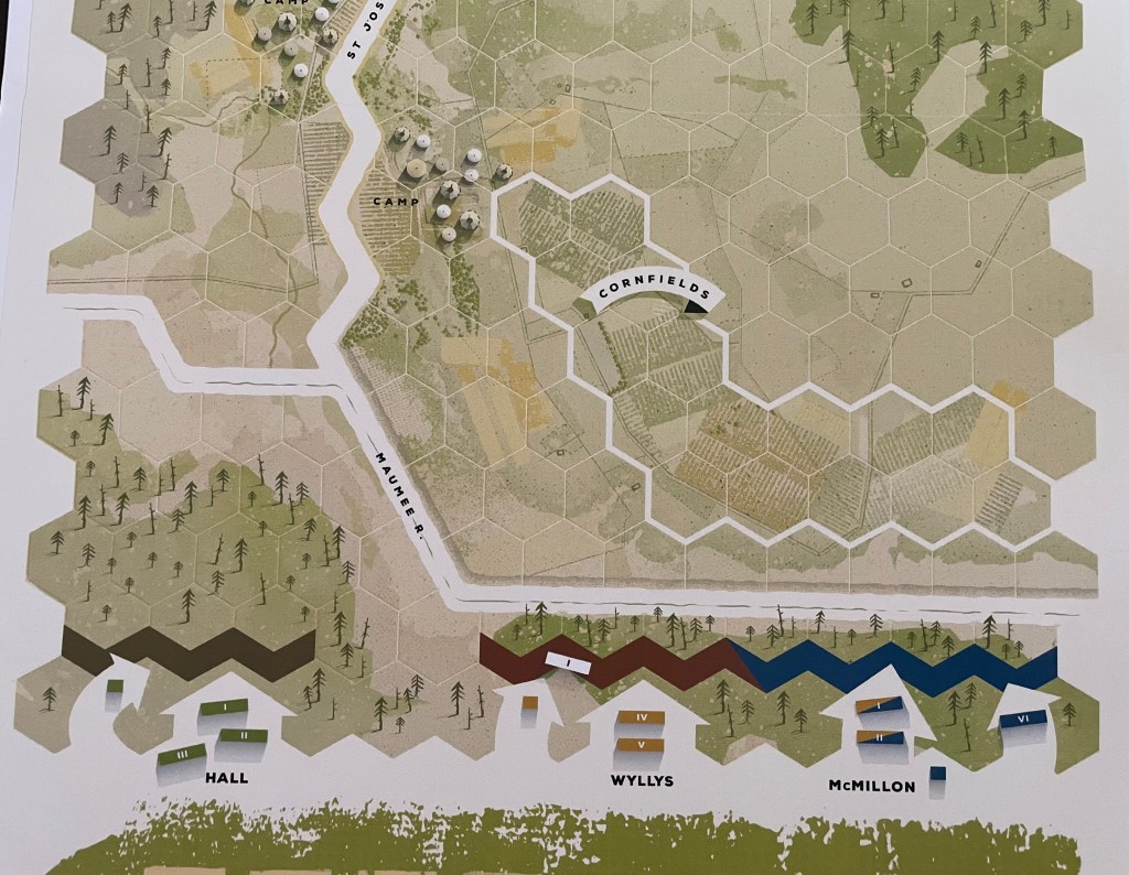 The board is spectacular and is focused on the main encampments of the Miami Indians located on the banks of the St. Joseph River. In the picture below, the encampments, which are referred to as Camp Ground on the terrain key, are shown just left of the center of the board surrounded by hardwood forests and adjacent to cornfields that provided the people their food.