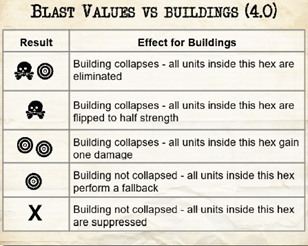 Wolfgang: Yes, if a target is in a building and a critical hit remains after the defense roll, a dice probe is made with the Blast Value. Depending on the result of this probe, the building may collapse or other effects may be triggered. If a building collapses the player marks this with one ruin marker on the map.