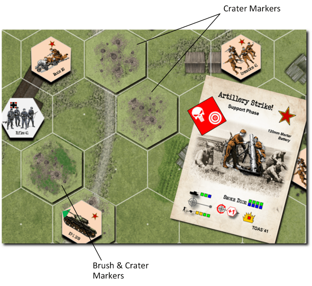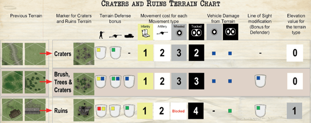 These terrain overlays have their own characteristics which are shown on the TA/OAS player aid. For example, infantry units on a free hex with craters now get a better defense bonus and vehicles are slowed down by craters