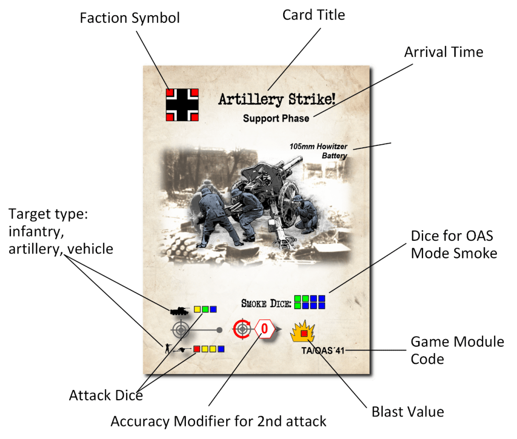 Wolfgang: Below you see an OAS card called “Artillery Strike!”. In this case it is the support of a 105mm Howitzer Battery of the German Wehrmacht. This battery has good combat values against soft targets such as infantry or artillery. The Accuracy Modifier tells us that this battery has no loss of accuracy on the second artillery strike. Unlike the original Command Cards, OAS has an arrival time stated on its OAS card, not an activation time.