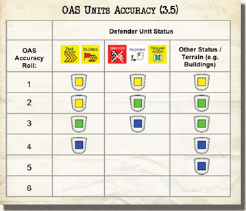 Accuracy Roll: After the owning player has decided the fire mode for their attack they must roll a D6 for the accuracy of the OAS. Some OAS units get an accuracy modifier for the second attack. Players should check the OAS card for this. The result of the accuracy roll can give the defending unit an additional defence die. If the OAS Accuracy roll is a 1 or less, after any relevant modifiers have been applied, and there are one or more friendly units in any hexes adjacent to the hex of the target unit a friendly fire attack will take place.