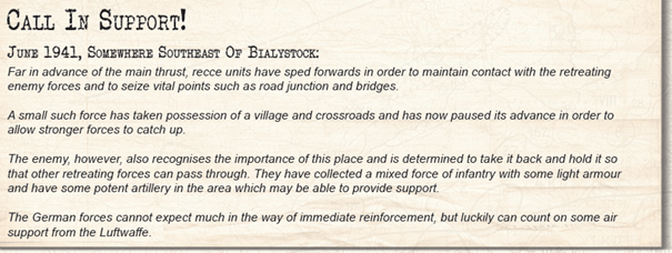 One scenario, “Call in Support!”, is about the region south-east of Bialystock, where a German advance unit has to defend a village with a crossroads from a Russian counterattack. The German forces are supported by the Luftwaffe.