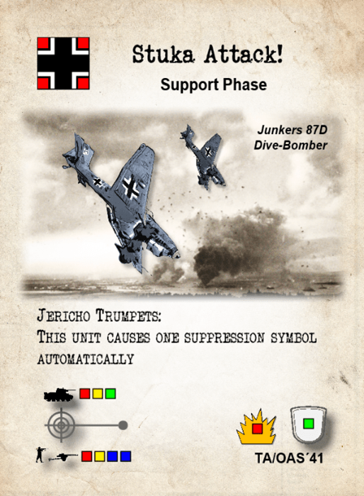 Wolfgang: The difference between TAS and OAS is that TAS does not require a spotter, but the target unit must first be sighted by the pilot, which can lead to inaccuracies or even friendly fire. TAS can also be repelled by AA units. OAS, on the other hand, is not. The OAS cards are somewhat stronger and have different fire modes, but they require an additional unit as a spotter to guide the artillery.