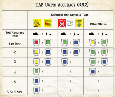 - TAS Accuracy: The active player must now roll a D6 for the accuracy of the TAS attack, applying any modifier received as a result of their spotting roll. The result of this roll is then cross-referenced with the status of the defending unit. This will tell the inactive player whether their unit will receive an additional defense die, and of which type, against the TAS attack. If the TAS Accuracy roll is a 1 or less, (after any relevant modifiers have been applied), and there is at least one friendly unit, (friendly to the TAS), in any of hexes adjacent to the hex of the target unit a friendly fire attack will take place.