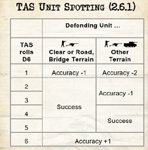 TAS Spotting: The active player must first perform a spotting roll for the TAS. For this the active player rolls a D6 on the TAS spotting table. This roll can be modified by Command Cards or special abilities of the TAS undertaking the attack. Vehicles in clear, road or bridge hexes. They are automatically spotted, and treated as if a Accuracy +1 has been rolled.