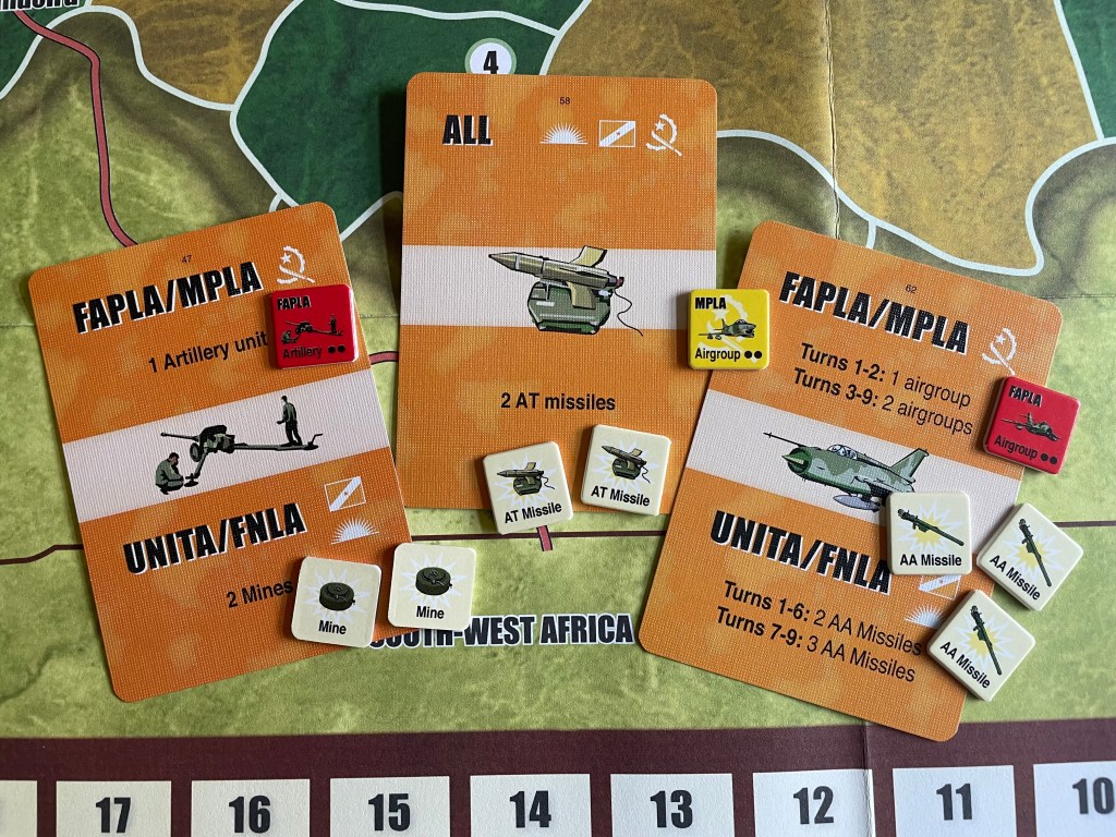 But this is not where the Foreign Aid stops. They will also give additional units under the Covert Foreign Aid. This Covert Foreign Aid represents advisors, mercenaries and equipment that is provided to the combatants secretly. At the end of this phase, the players will get a chance to secretly bid for a number of reinforcement cards between 0-5. Players will use a d6 to record their bid secretly and then all players will reveal their bids in Turn Order. Then in Turn Order, the players will draw the number of Reinforcement Cards that they bid for and get those assets from their supplies. If a single bid was higher than the other bids, this will lead to a Propaganda Victory for the highest bidder’s opponent. This Propaganda Victory means the opposition will gain a VP. Think of this as your enemy saying to the people of Angola that the FAPLA/MPLA coalition is taking aid from foreign masters and not trusting in the strength of the people. This casts some doubt in the minds of your supporters and foes alike and hurts you in the long run. So this is a really tough choice that matters for the players. The benefits of the Foreign Aid are obvious and when you are behind sometimes you have to simply bite the bullet and bid high so you can assure yourself of the needed assets to get yourself back into the fray. But this choice can put you even farther behind the leaders and you have to think this through carefully. I also thought that this part of the game became somewhat of a cat and mouse game as well. You can bid high an assure yourself of lots of aid with a VP loss, or bid low, even if you badly need the aid to take advantage of your opponent and close the gap with a Propaganda Victory of your own. Really interesting choice here that plays into the strategy of the game.