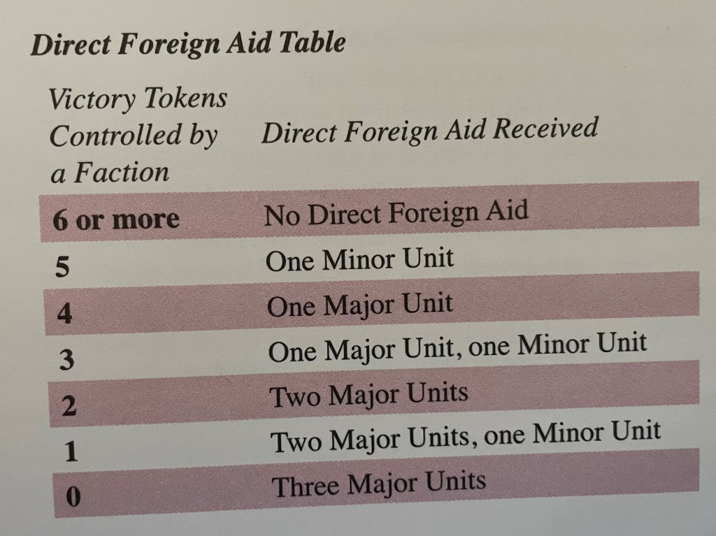 As this Civil War was backed and funded at least partially by outside powers, and the fact that Zairos, South African and Cuban troops fought in Angola, the design incorporates the concept of Direct Foreign Aid and Covert Foreign Aid into the game. At the end of a Turn, the players will count up the number of Victory Tokens that they control. These Victory Tokens represent the control of cities and towns on the board and when a player loses a location, they have tp provide that Victory Token to the player that took it from them. As you can see in the Direct Foreign Aid Table below, players that have a lot of these Victory Tokens don’t get Foreign Aid as those countries willing to give to the cause are always watching and monitoring the situation. You do really well without their help and they will not help but if you struggle and are losing the war and losing ground, they will step in and provide a certain number of random units.