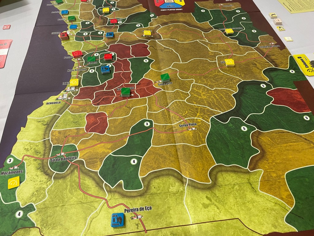 This game is very fiddly. There I said it. There are large stacks of counters, sometimes 10-12 high depending on the number of units included and the Equipment counters, and it can be really painful to remember what is included in them and precarious to move them about. I have sausage like fingers and found myself awkwardly fumbling around, trying not to topple my stack or my opponents’ stacks over as I was moving my stacks all the while trying to be cagey and not exposing the inclusion of the best counters in those stacks. That to me is fiddly. The combat was also a bit fiddly and is not your typical odds based calculation and CRT analysis that we find in many wargames. Also, the game is not for the feint of heart as it is long playing and the rules have something to be desired in their organization and structure. It is also not elegant as I have seen many others describe it as. I would say that nothing about this game is really elegant, but…all that being said, it manages to do something truly unique and continually blew my mind how it all just seemed to perfectly work together to create an engaging, interesting and strategically deep game of area control. I for one really love this game and can let it’s warts be overlooked because it precisely does what it tries to do and that is simulate the chaos of a Civil War in Angola.