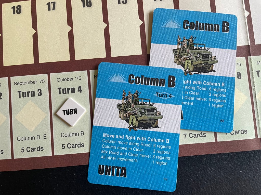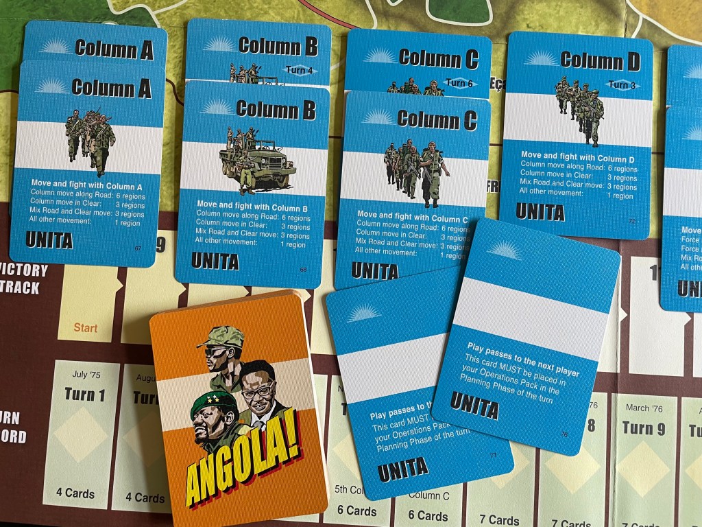 The other really interesting part of the cards is that each player other than FNLA has at least 1 Pass Card in their deck that they have to include in their final constructed Command Deck each turn. In fact, the UNITA player has 2 such Pass Cards and these can be really painful if you don’t plan well and take your pass(es) at the right time! Not being able to do anything for a full turn doesn’t feel good but your only solace here is that every player has to experience a pass and you will have an opportunity to deal them some pain before you have to pass, or even pass again in the case of UNITA. I found in our play that lots of us chose the Pass Card early in our decks as sometimes you do want to sit back and see how things are going to play out before you commit yourself to your course of action. But, if you do this each turn, your opponents are sure to pick up on this tactic and make you pay for it…but that is what is great about this aspect of the game.