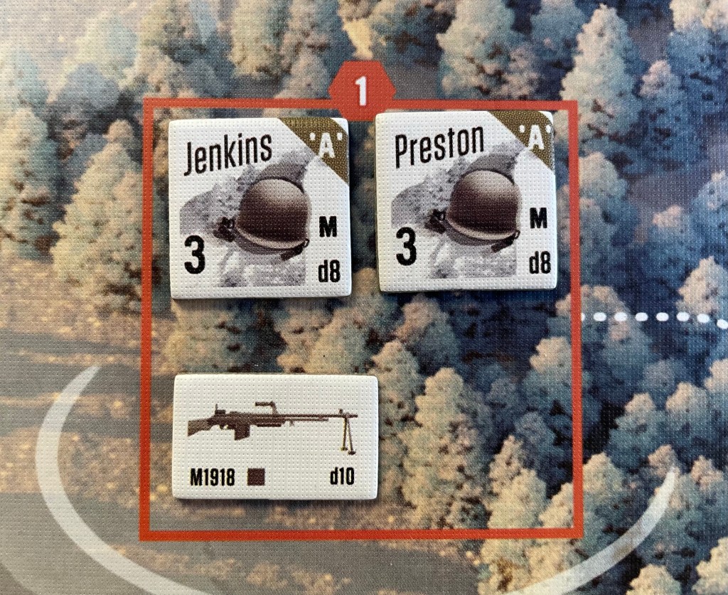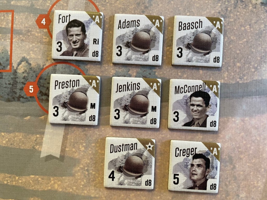 The Defender Counters anatomy is pretty simple as you can see in the picture to the right. At the top of the counter, each Defender Counter is named based on the historical soldiers participating in the defense of Lanzerath Ridge. Also at the top right is their squad designation being either Squad A, B or C and each squad is identified with their own color. Squad A is brown, Squad B is blue and Squad C is green. There are two other counters who have no specific squad designations but have a star shown with a red banner, which denotes that they are your “wild” counters and can use their Attribute on any counter belonging to any of the various squads.