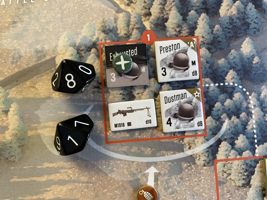 Radio is an Action Designator that is generic and allows, as opposed to the more specific Ra or Ri that we will cover next, the unit that carries it (Bouck) to do either of the types of jobs associated with the radio. This means he can call in an artillery strike or report intel back to command CP about enemy strength and movements. This is a very versatile ability because during the course of the game, you will most likely lose one of the other two specific radio ability counters and Bouck can fill in and do their duty in their absence.