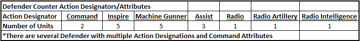 There are several different types of Action Designators including C – Command, M – Machine Gunner, A – Assist, R – Radio, Ra – Radio Artillery and Ri – Radio Intelligence but only one Attribute that we have already discussed in the Inspire Attribute. The Inspire Attribute requires no action being taken for the benefit to Defender Counters and is considered to be an active ability. The only caveat with Inspire is that units with the Inspire Attribute can only Inspire units matching their Squad. The only exception to this is the “wild” units mentioned before that have the red stripe in the upper right hand corner. They can Inspire units from any of the different squads. The Inspire Attribute is shown with a star in the top right corner of the Defender Counters that have the attribute. When the player takes various actions though, some of the actions will require specific Action Designators as a prerequisite to take those actions. Let’s take a look at each of these in turn. Here is a distribution of the number of the various Action Designators and Attributes on the Defender Counters. Remember that some counters have multiple Attributes and Action Designators.