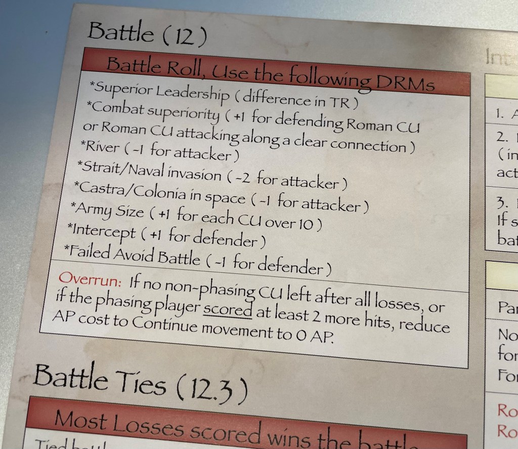 The designer has stated that his “design goal was to have the Barbarian powers “fight well” through numbers (i.e. roll on a higher column of the CRT) while the Roman powers would “fight well” thanks to higher DRM’s (through better leaders, combat superiority, etc.)”. I would say that this was definitely the case and we found that the Romans had some really great DRM’s as you can see above, but the Barbarians were simply about numbers and continual attacks causing compounding losses that over time really degrade the effectiveness of the Romans.
