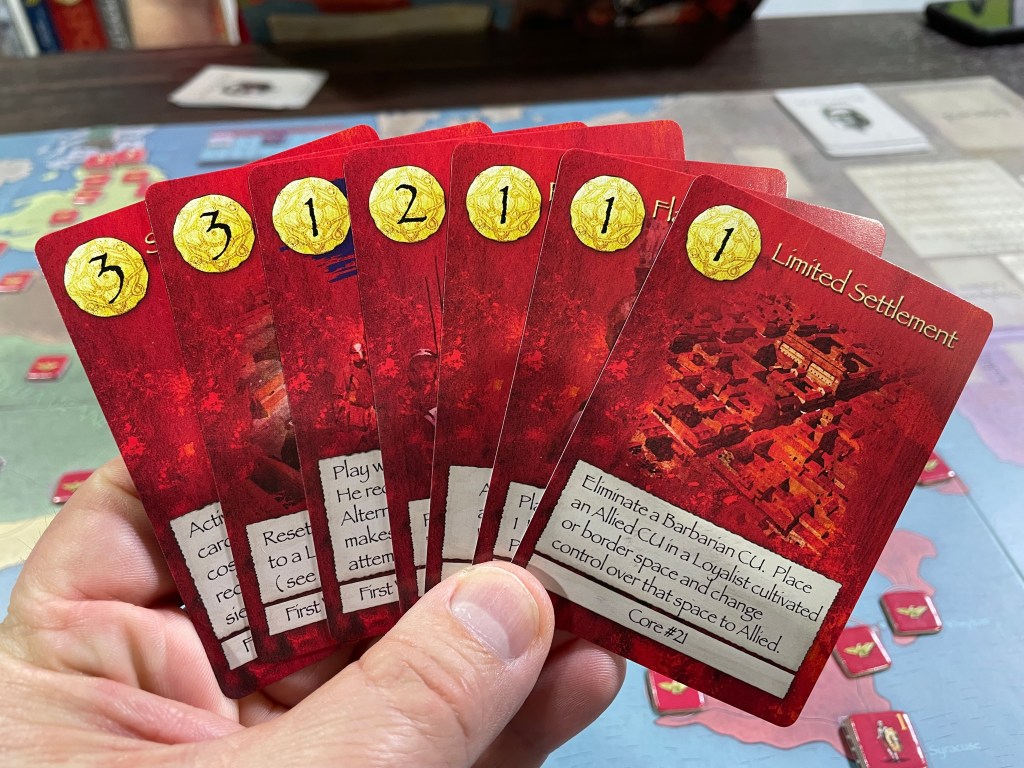 When an Activated leader has successfully moved to a space containing enemy CU which did not evade their advance a battle will be initiated. The process is pretty simple as first, each player starting with the Active player has the chance to play a single Battle card. These Battle Cards have all types of effects from adding CU, removing enemy CU or giving DRM’s. Making sure to use these cards wisely is one of the best parts of the combat and kept it very interesting as you never really knew what was coming. You can see the stacks before you and guess at their strength compared to yours but you don’t know what cards the players might have in their hands. Next, each player determines their DRM’s and makes a D6 roll, checking the modified roll result on the CRT, which expresses as a result of the number of enemy CU killed in battle. The higher rolled number wins the battle even if no CU are left, with ties determined first by participation of Roman CU with Romans always winning ties and then in favor of the attacker if both sides didn’t have Roman CU or the defender if both sides were composed of Roman CU. The loser has to retreat from the battle (either to their space of origin if the attacker or to any adjacent space if the defender. The winner, action points permitting, can continue movement and attack again if they choose. This is a great way to maximize the players card plays to do the most damage and make progress toward their goals. The CRT is determined with a single D6, but the results can range much higher due to various DRM’s. The results can actually range from less than 1 to 10. This means DRM’s can have a huge effect on battles and it is not unusual for a player to have a +4 DRM on their battle roll.