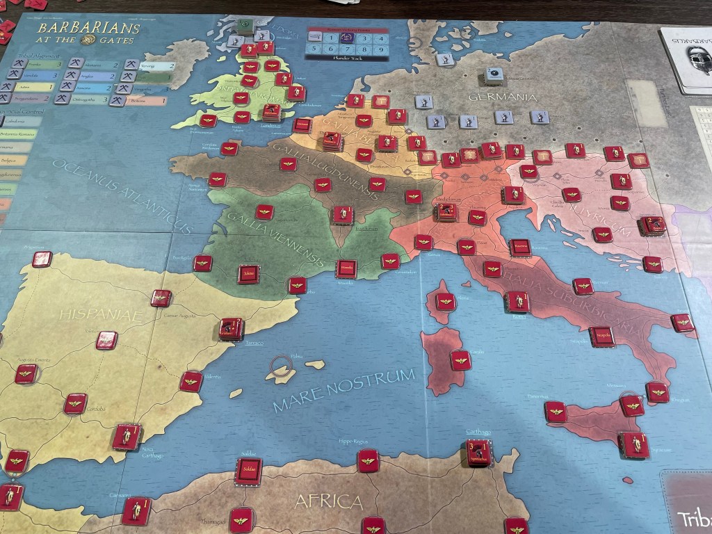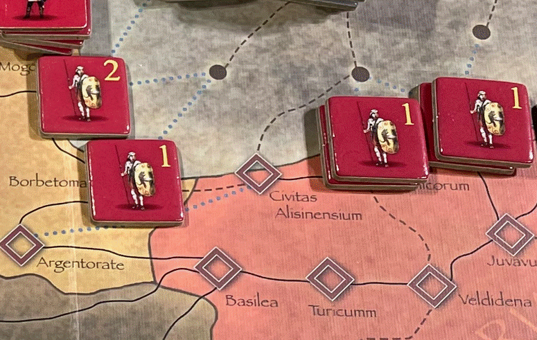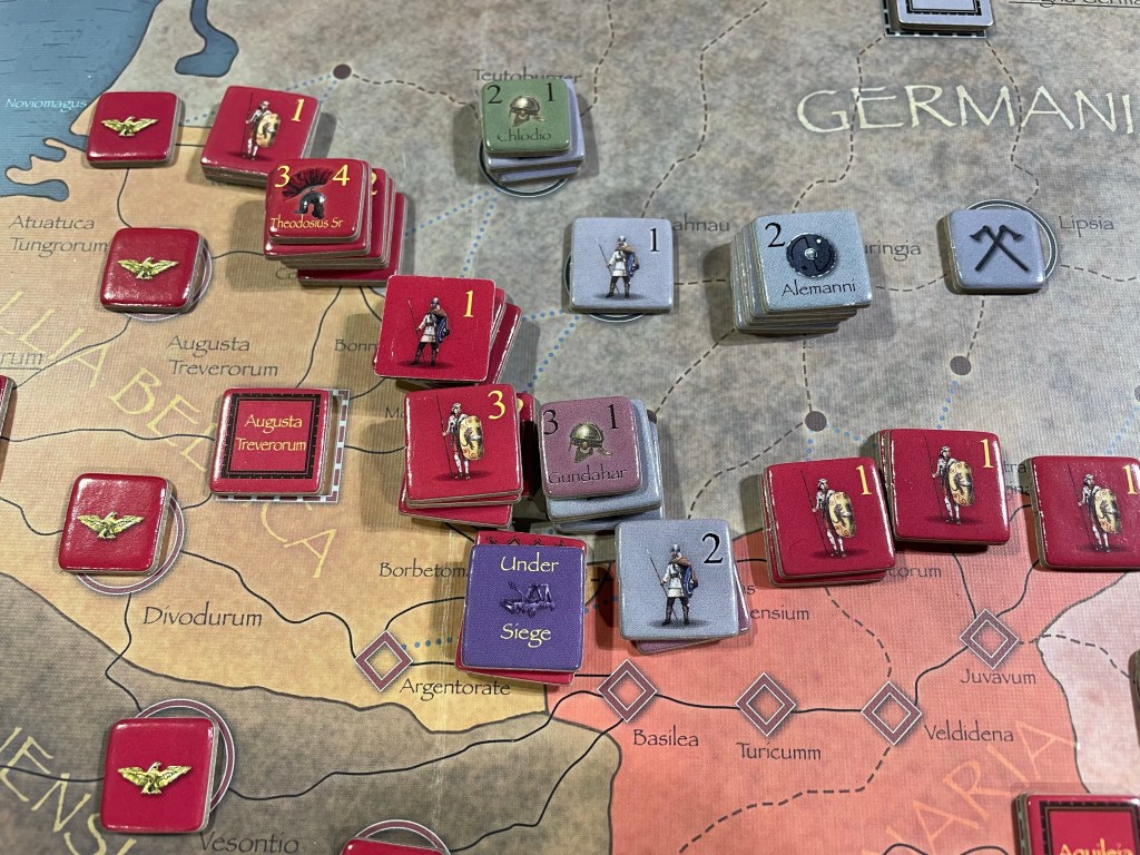 The main focus of the game, at least initially, is the Danube–Iller–Rhine front. This line of forts and encampments is the first line of defense against the incursions of the Barbarians and sees lots of probing attacks and sieges. The Barbarians have to break this line somewhere in order to force the Romans to take action. The real difficulty here for both sides is that it is a numbers game. The Romans have just enough forces to spread out and have at least 1-2 CU in each space and also have the ability to construct numerous Castra and Colonia to provide better defensive benefits in combat. There are no real weak spots along the line but the Barbarian player has to decided when and where to strike and then cannot relent. They have to have consistent pressure to make the Roman player have to commit more resources to reinforcements and moving CU up to plug holes.