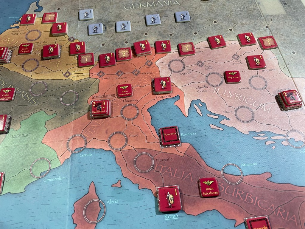 As I have already mentioned, the game is played on a Point-to-point map of the Western Roman Empire, which is divided into 11 different diocese or administrative districts such as Gallia Belgica, Caledonia or Italia Suburbicaria, each composed of spaces for major settlements and cities such as Roma, Massilia or Nova Carthago. These spaces are connected to each other through the network of Roman roads, rougher connections found mostly in uncivilized territory or river connections mostly on the Donau and the Rhine.