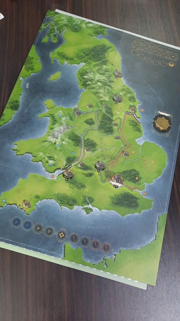 The board includes the entirety of lower, central and northern England, Wales, Scotland and shows parts of Le Continent (France) and Ireland as well. But the action takes place only in the bounds of England proper and Wales and no units are allowed to enter France, Scotland or Ireland although some units will start in Ireland and Scotland. This is a local fight and the board focuses on this. The board also uses area movement and different areas are sectioned off using dotted lines that are very clearly seen on the board. The green backdrop of the grassy land aids in these lines being easily recognizable.