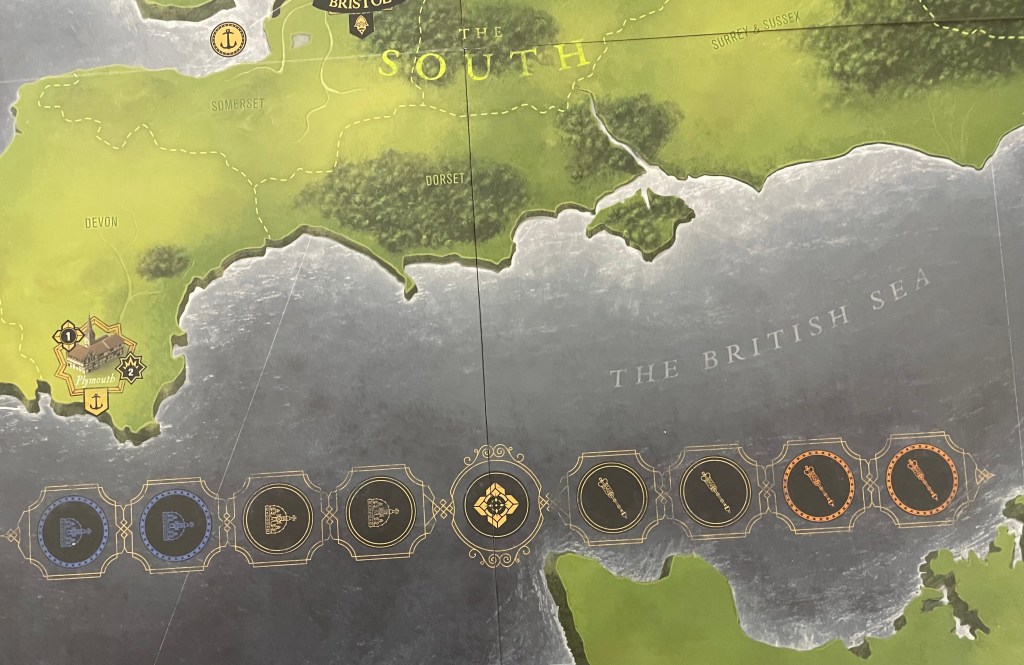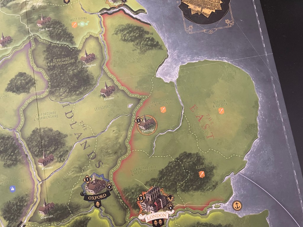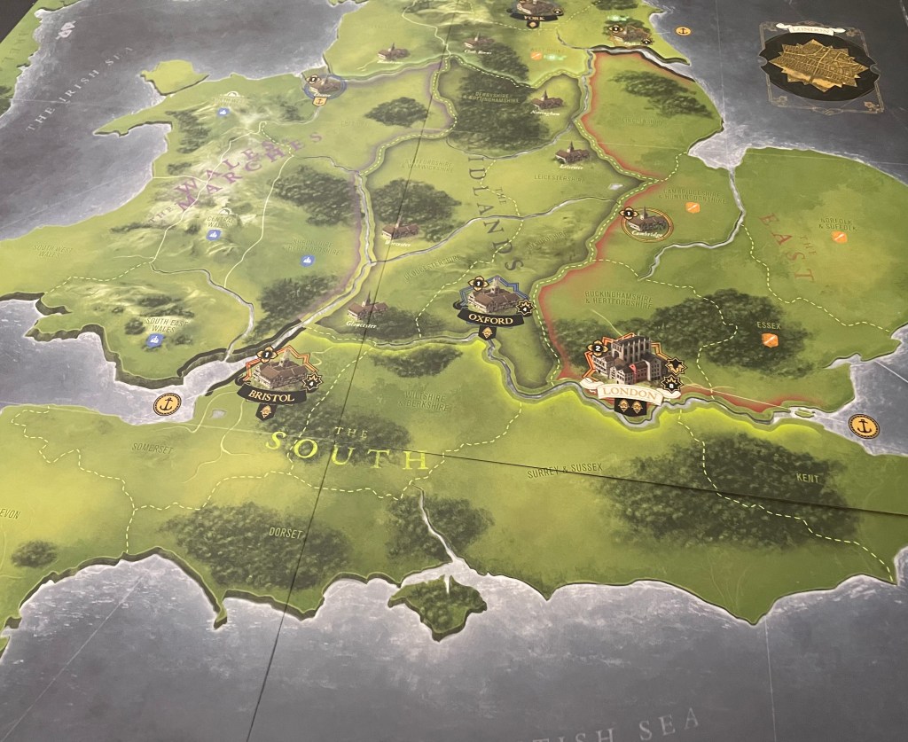 Now let’s take a closer look at some of the regions, and their really well done graphical touches to make them stand out. Sothern England, or The South as it is referred to on the board, is home to four large Major Cities including London, Oxford and Bristol and 1 Minor City in Plymouth.